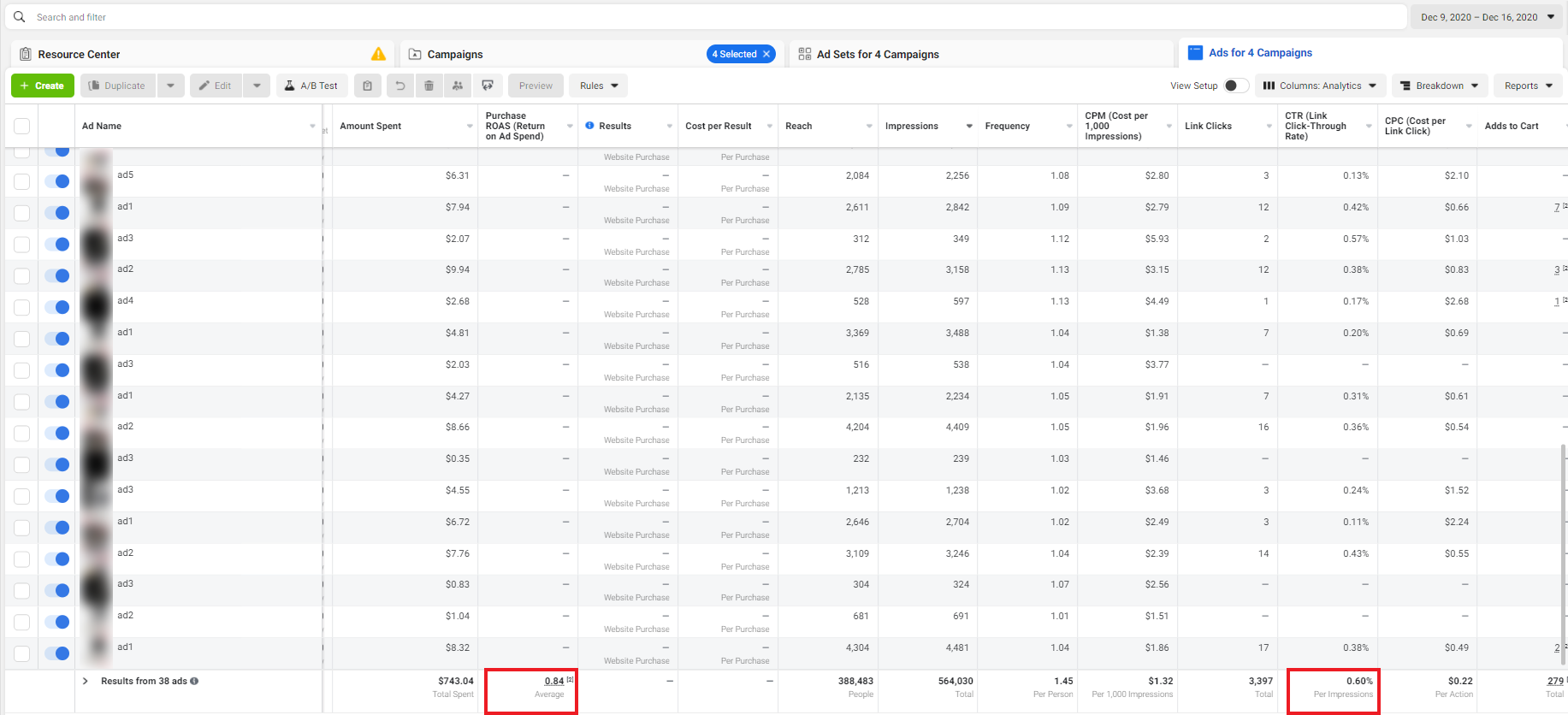 Here it is. As you can see, we’ve got a ROAS of x6.74 with a CTR of 0.38%. We’ve been totally satisfied with this result as well as our client (The KPI for ROAS was x4). And during tests we’ve tried to increase our CTR by using pretty designer creatives, and here are the results: